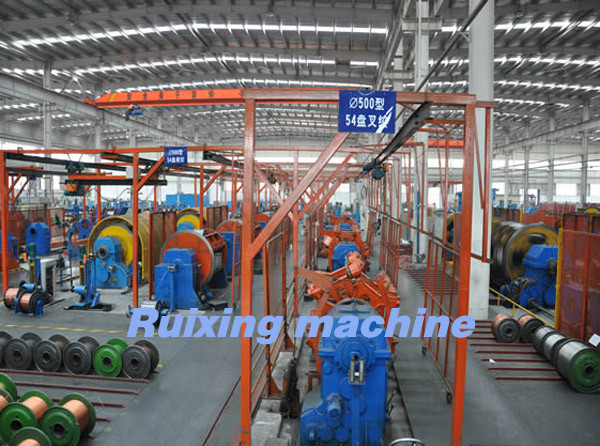 Center pay-off strand, stranding cartage, compact die stand, double draught wheels, take up and traverse device, mechanical transmission system and electrical control system.